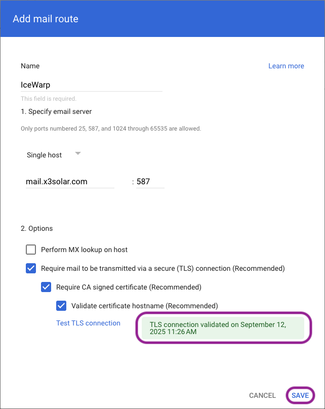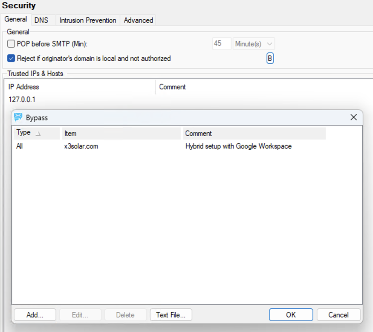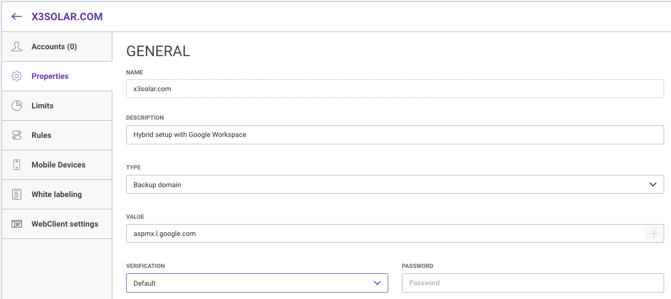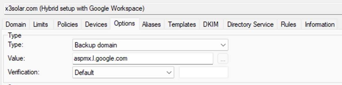 To enable communication from IceWarp users to those living on the Google Workspace, we have to switch the mail.x3solar.com server to be a part of the distributed domain, which includes both servers.