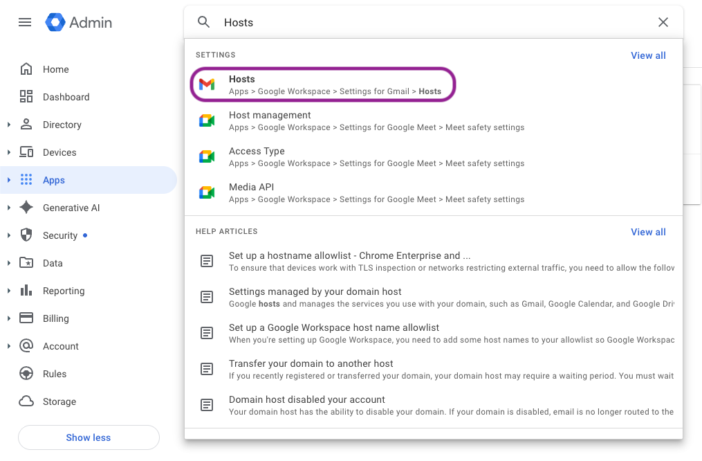 Let's go to the Google Workspace Admin center -> Apps -> Google Workspace -> Gmail (or Settings for Gmail) -> Hosts. You can also use a search bar.